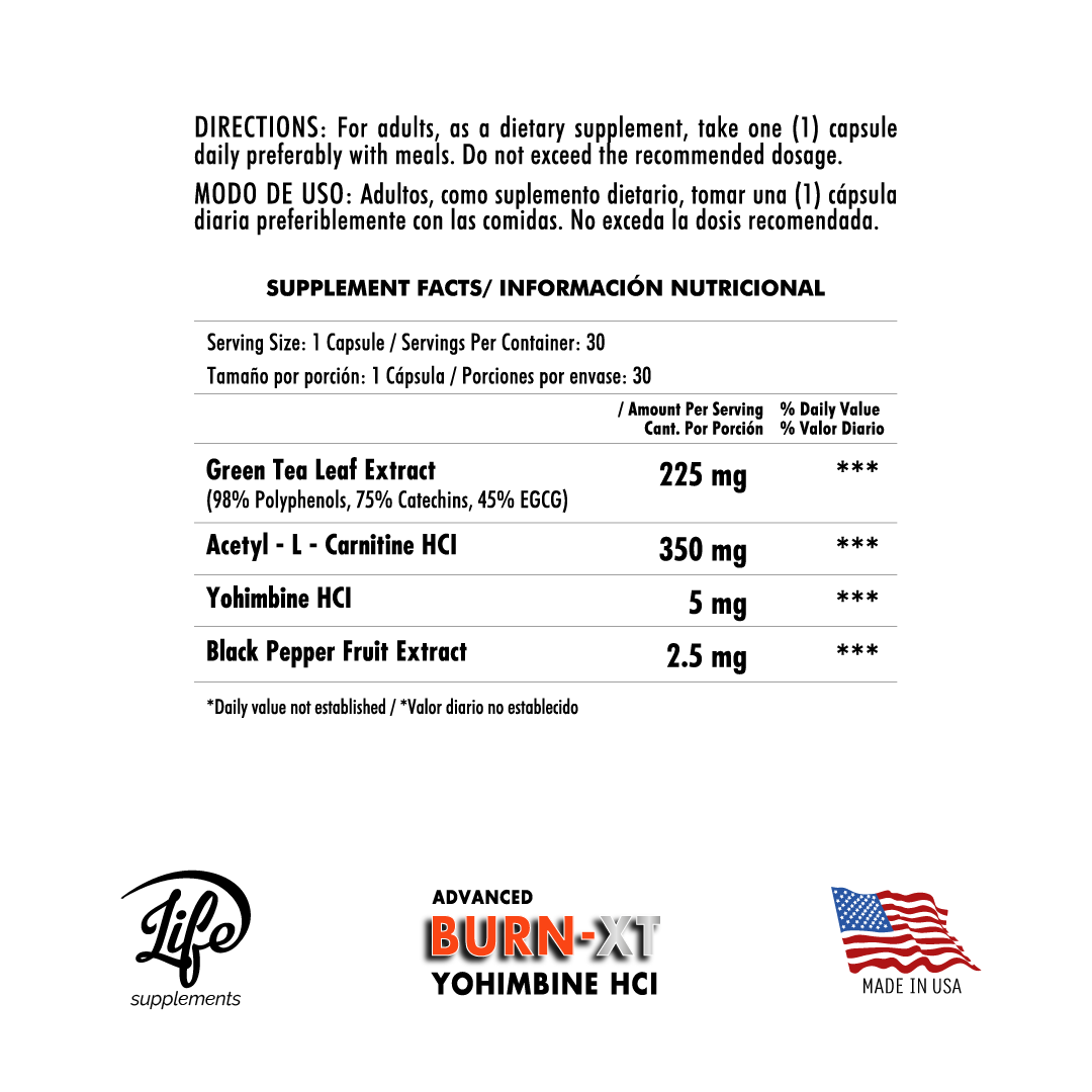 BURN-XT (Yohimbine HCI), es una fórmula de pérdida de grasa que ayuda a acelerar la quema de calorías y la actividad metabólica.
